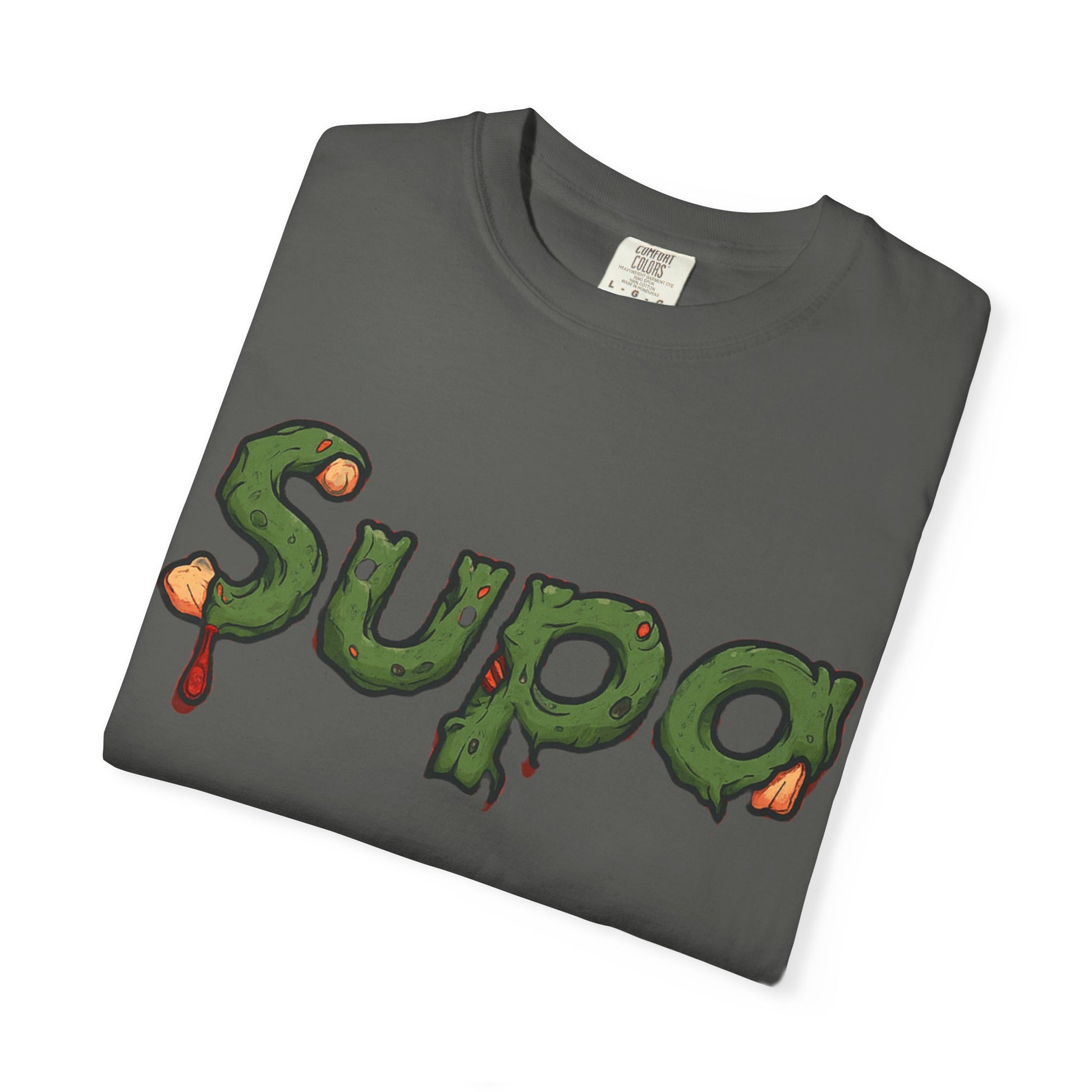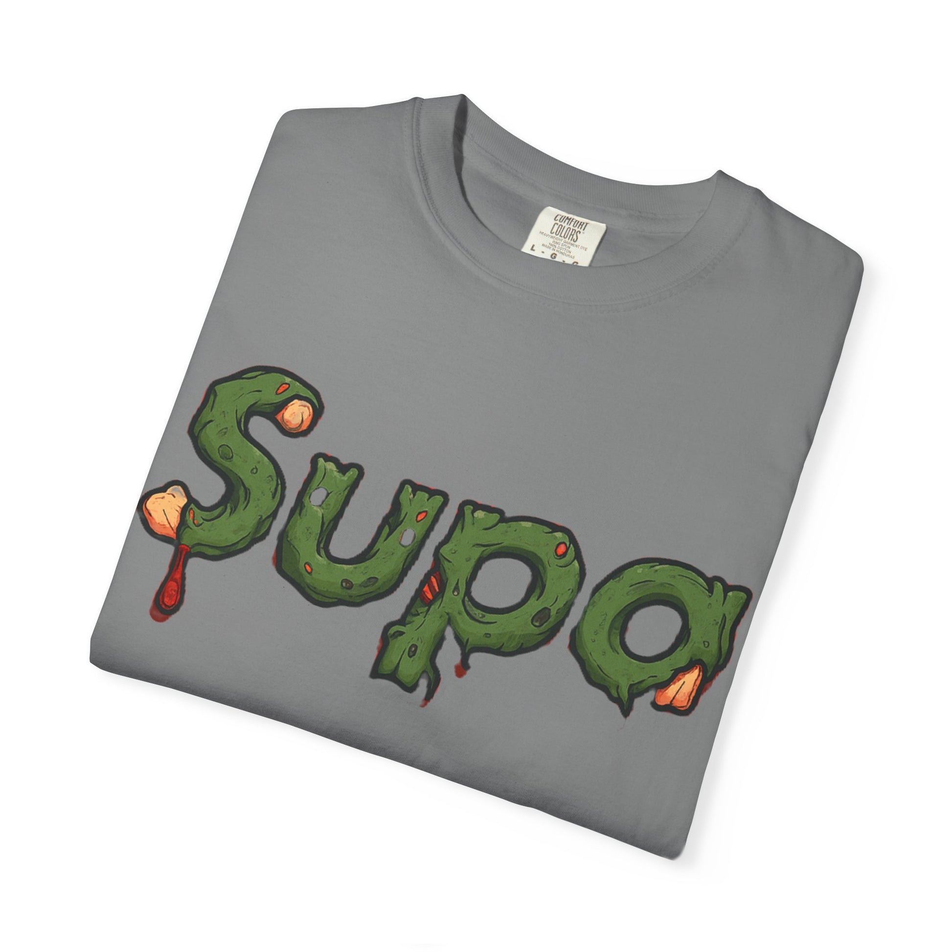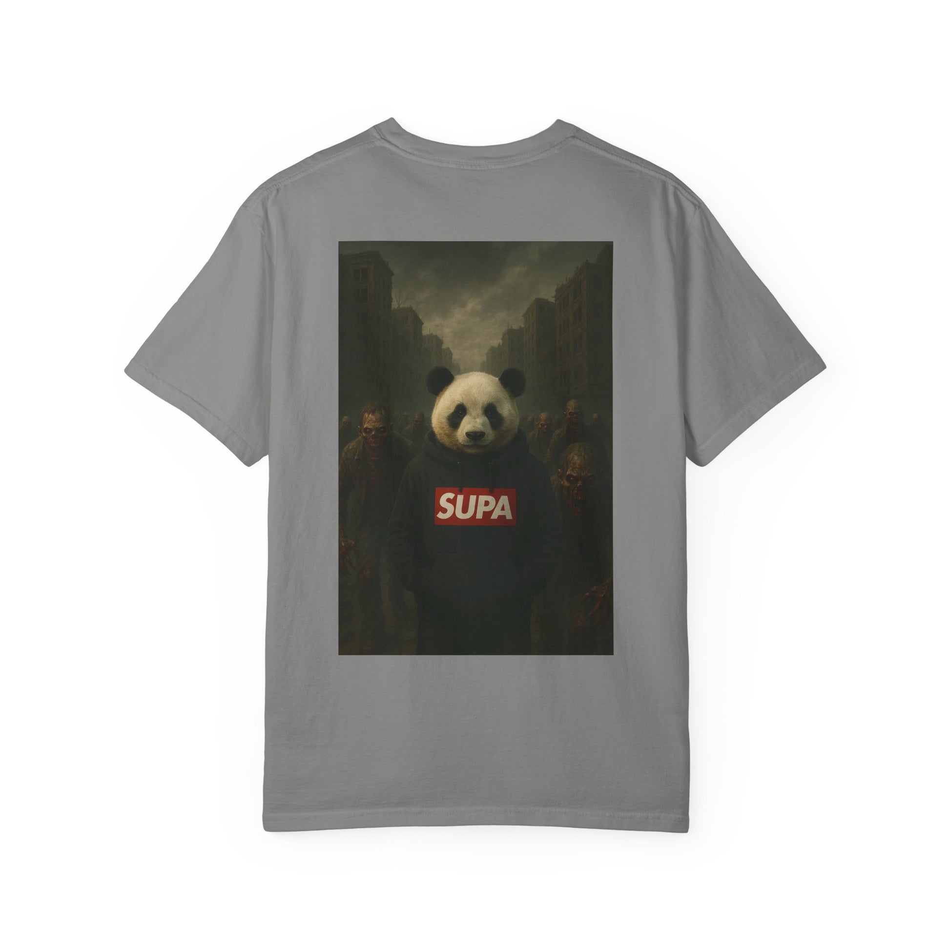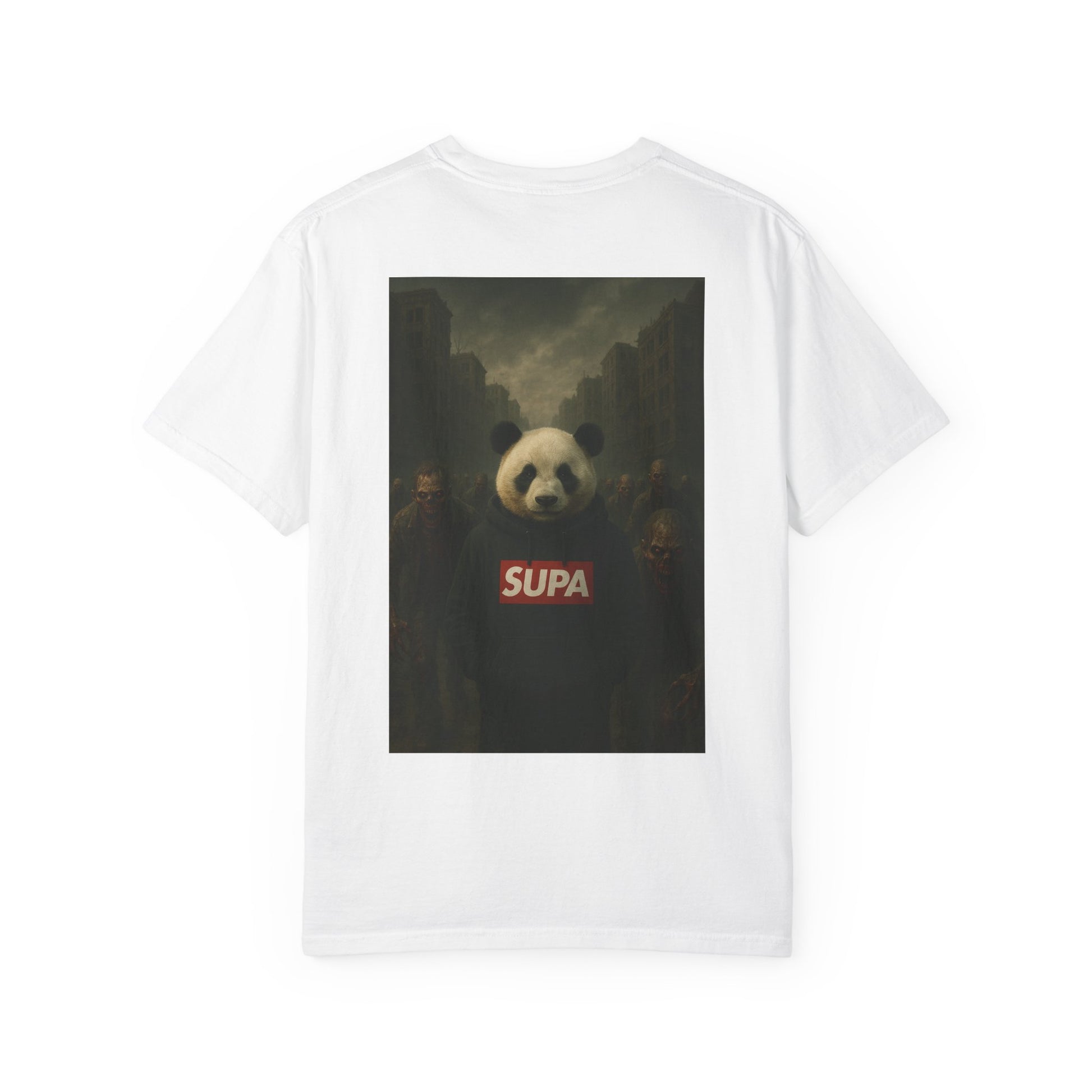 This garment-dyed tee carries streetwise attitude with a soft, lived-in feel. The front shows a dripping, mossy “Supa” wordmark with a gritty texture, while the back features a moody, cinematic panda portrait wearing a bold SUPA logo—urban surrealism with a touch of dark whimsy. Lightweight but substantial, the relaxed fit and pre-shrunk 100% ring-spun cotton make it comfortable for everyday wear. It layers cleanly under jackets or stands out solo during late-night walks, skate sessions, or gallery hangs. The garment-dye process gives each shirt a subtle, vintage color depth that complements the design’s brooding palette, so it looks like it’s already been part of your rotation.